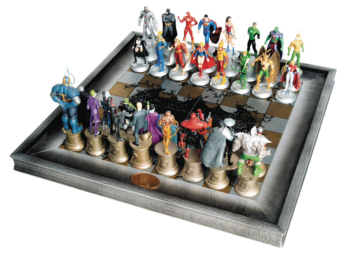 Available in one package for the first time ever - the entire DC New 52 Chess Set from the DC Comics Chess Collection. The set includes 32 unique figurines from the DC universe - 16 heroes vs 16 villains - plus a deluxe chessboard. Each of the figurines are 1:21 scale and cast in metallic polystone resin.