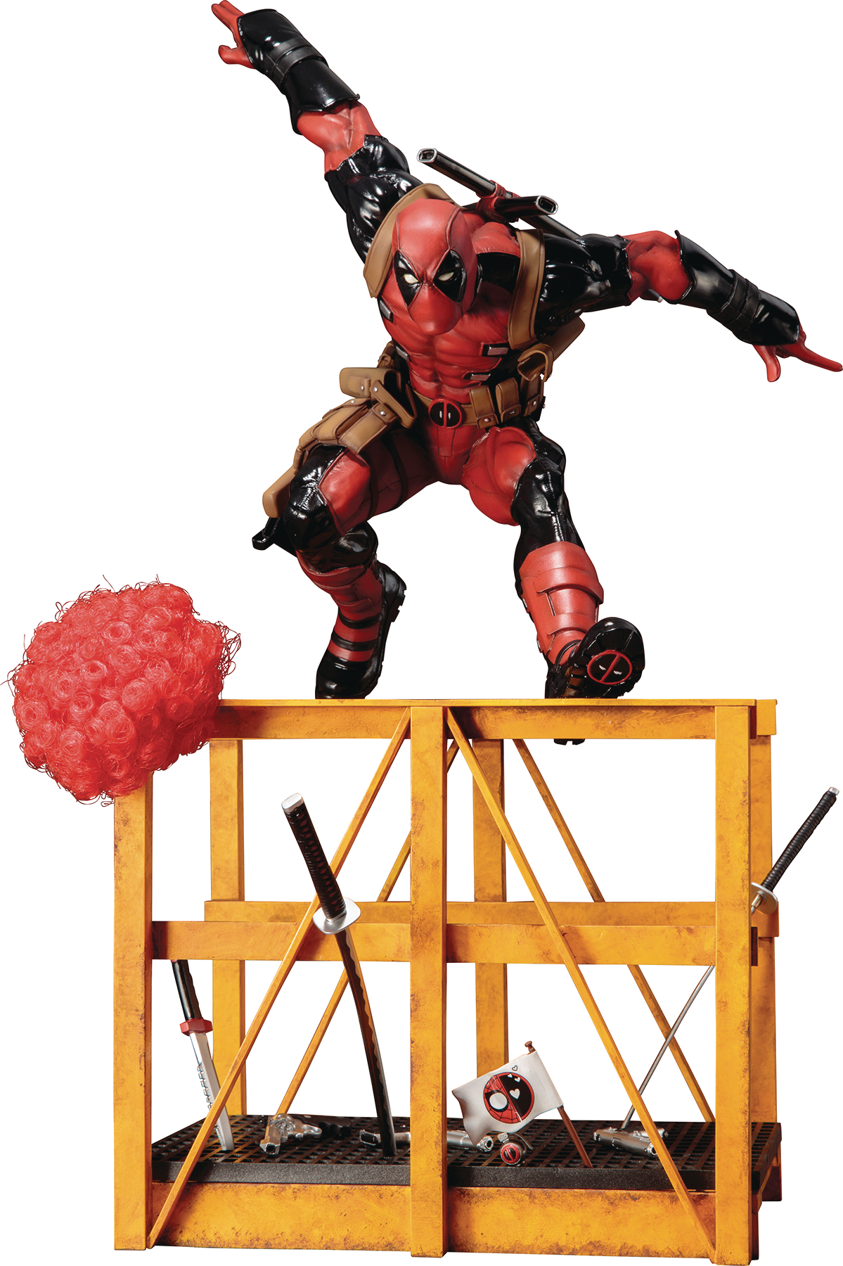 From Kotobukiya. The Merc with the Mouth is back in action! Deadpool is captured in mid-leap as he races across racks in a warehouse (whether he's there to steal or to protect innocents is up to you!). His action-packed pose has him kicking off with his right foot and just touching down on the next rack with his left. Deadpool has his arms spread out for balance and his head extended forward keeping his eyes on the prize. Wade's costume is incredibly detailed, fully replicating its appearance from the Marvel Now! comics era. Its red and black bodysuit has armored sections, seams, stitching, buckles, padding, mini Deadpool logos on the belt and the bottom of his shoes, and so much more. There are even sweet 90's style pouches, and because it's Deadpool some of them are upside-down! Sculpted by Junnosuke Abe, the stunning Super Deadpool is a towering 17" tall (1/6-scale) as he strides across the unique building features of this presentation.