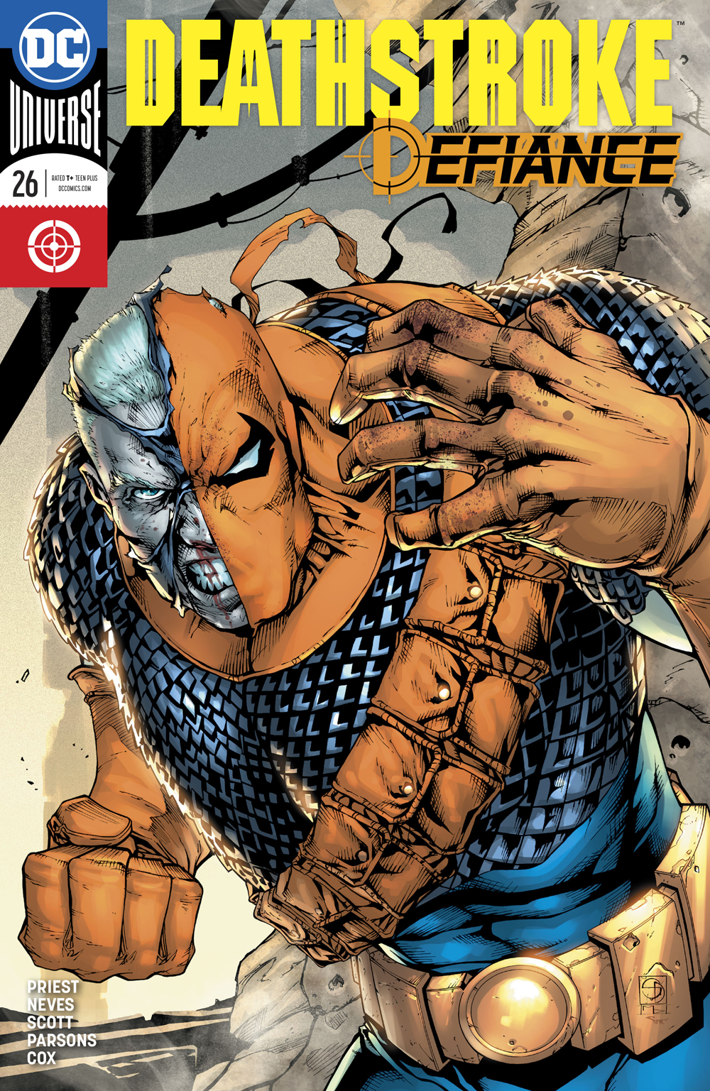 "The Fall of Slade" part one! Finally convinced that their leader is missing, Team Defiance begins the search for Deathstroke only to discover his situation is even more dire than expected. Meanwhile, Deathstroke-after being kidnapped by the Secret Society of Super-Villains-finds his past catching up with him when his former friend and ally Dr. Ikon confronts the repentant killer while repressing his own uncontrollable rage.