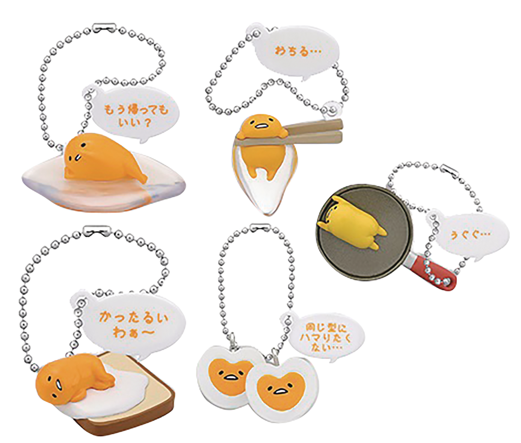 Enjoy a little mystery with this Gudetama the Lazy Egg key chain figure. The blind bag packaging conceals one of five adorable characters depicted on items such as a frying pan or chopsticks.