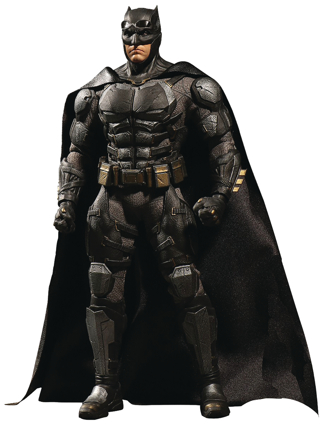 One:12 Collective Tactical Suit Batman has two head portraits and a newly designed, film-accurate tactical suit. Designed for combat, the tactical suit was created to handle combat situations with super powered adversaries. The figure comes equipped with 2 pairs of goggles for display in up or down positions, a Parademon rifle, a trio of Batarangs, three grenades, and a grappling gun with three assorted hooks. He also includes a display base with logo and adjustable display post along with a cape clip with posing wires for dramatic displays.