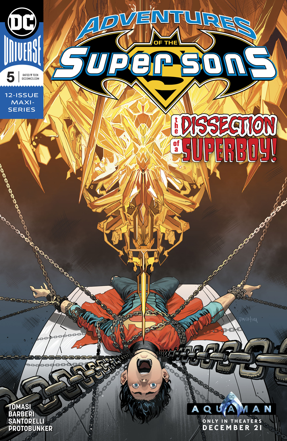 The Super Sons need a break!! After the space adventures of the past few issues, Jon (Superboy) and Damian (Robin) take what they think is a peaceful diversion to what winds up being a miracle-machine planet (as tends to happen in deep space). There, they get a look at their potential future selves, including a surprising preview of parenthood!