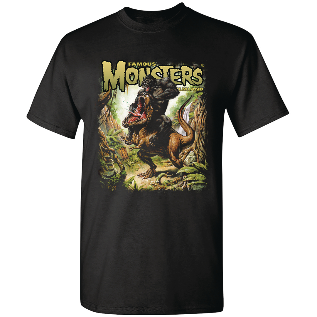What's the most memorable moment from the original KING KONG (1933)? Many would say it's the giant ape's Skull Island battle against carnivorous dinosaurs! In honor of Kong's victory over a small population of Tyrannosaurus Rexes, Jason Edmiston painted this cover for FM's King Kong tribute issue, #267, and now you can wear it on a t-shirt