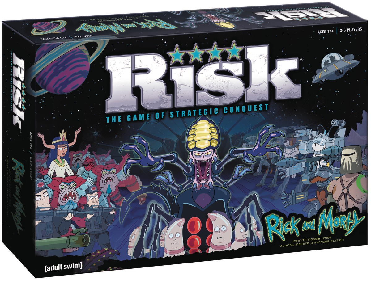 Risk edition features factions of beings from the show, vying for control of Planets and Locations along the Central Finite Curve. The five power driven factions include Mythologs, Robot Dogs, Gazorpians, Post-Apocalyptic People, and of course, the U.S. Government. Each faction will have its own Leader that grants extra power in the territory the Leader occupies.