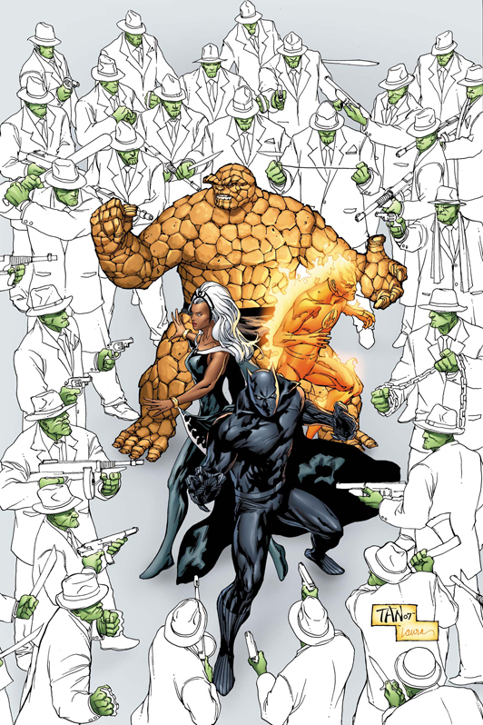 Someone get them a road map! The new Fantastic Four have just taken another wrong turn on the dimensional superhighway -- and this time, they've landed in the middle of a gang-war between machine-gun toting Skrulls! Gangsta-gangsta!