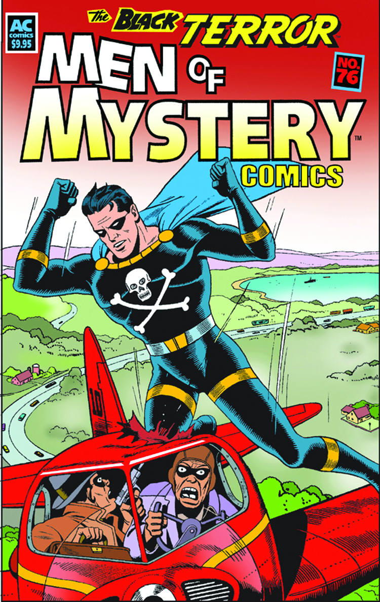 Men of Mystery has a particularly pulpish flavor this issue, with much of the material taken from the comic-book divisions of the biggest pulp magazine publishers of the medium's heyday. The Black Terror was the biggest star produced by Nedor Comics, while Sure-Fire stars Flash (later changed to "Lash" ) Lightning and The Raven were the progeny of L.L. Wynn's Ace Publications. And the eerie, atmospheric artwork of Bob Fugitani on The Hood would have been at home in the weirdest of the weird pulps of the day. This issue boasts two Black Terror tales, the Hood in "The Man Who Sold His Soul To The Devil," plus Flash Lightning, The Raven, and Major Midnight!
