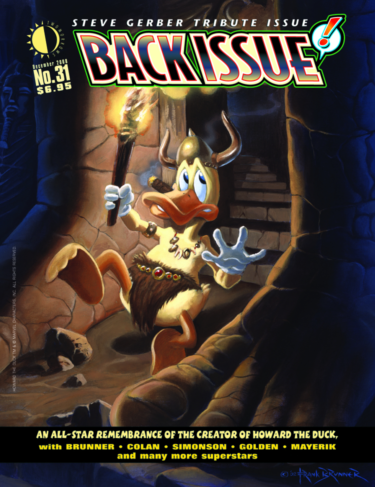 Thundarr the Barbarian. An all-star lineup of comics and cartoon creators pay tribute to Steve Gerber, with art by and commentary from Frank Brunner, Rich Buckler, Gene Colan, Michael Golden, Stan Lee, Paul Levitz, Pablo Marcos, Val Mayerik, Jim Mooney, Martin Pasko, Mike Ploog, Dave Simons, Roger Slifer, Walt Simonson, Ron Wilson, and many, many others. And Howard the Duck turns barbarian in a cover painting by Frank Brunner!