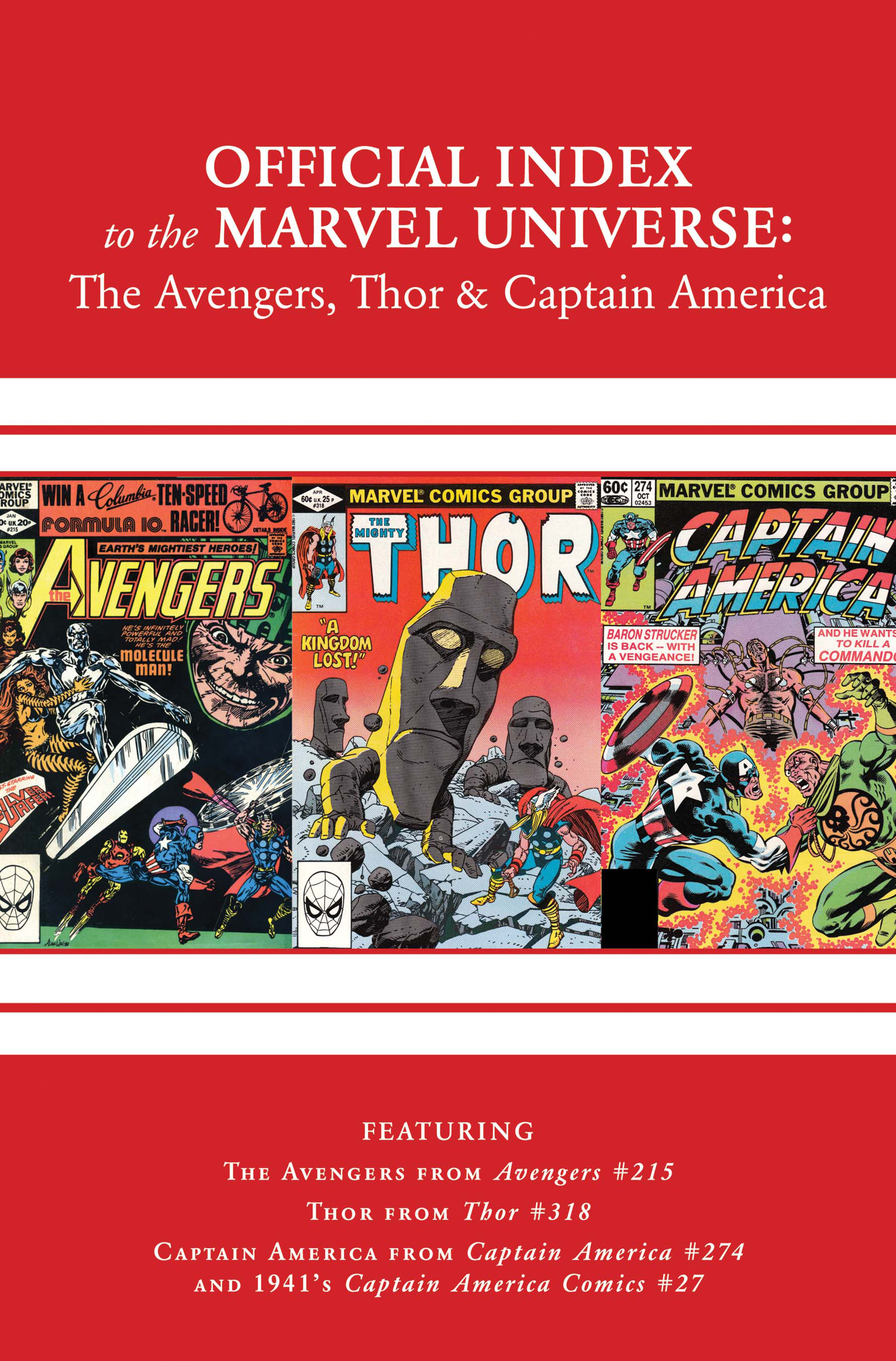The chronicle of the Marvel Universe continues as the All-New Official Index to the Marvel Universe delves into the history of three of Marvel's most enduring titles! Return with us to the Silver and Golden Ages as we continue our coverage of the Avengers (from AVENGERS #215), Thor (from THOR #318), and Captain America (from both CAPTAIN AMERICA #274 and 1941's CAPTAIN AMERICA COMICS #27). Watch the Marvel universe's history unfold month by month as each issue provides synopses for dozens of individual comics, including back-up strips, introducing the characters, teams, places and equipment that appeared within, providing vital information about first appearances, where they last showed up and where they appeared next!64 PGS./Rated A