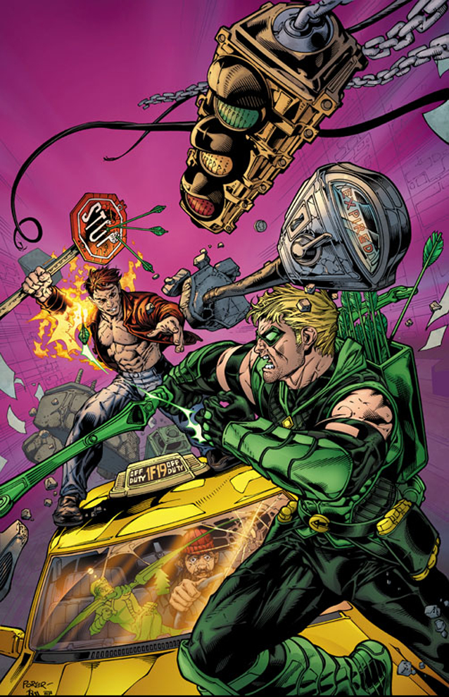 The Jersey Shore of super villains crashes Seattle to stream Green Arrow's death over the Internet! It's the final fight between Green Arrow and Rush: media maven vs. media star! The whole world's watching on their QPhones and QPads. Why aren't you? Plus: Queen Industries launches their new initiative - and issues a challenge to the world!