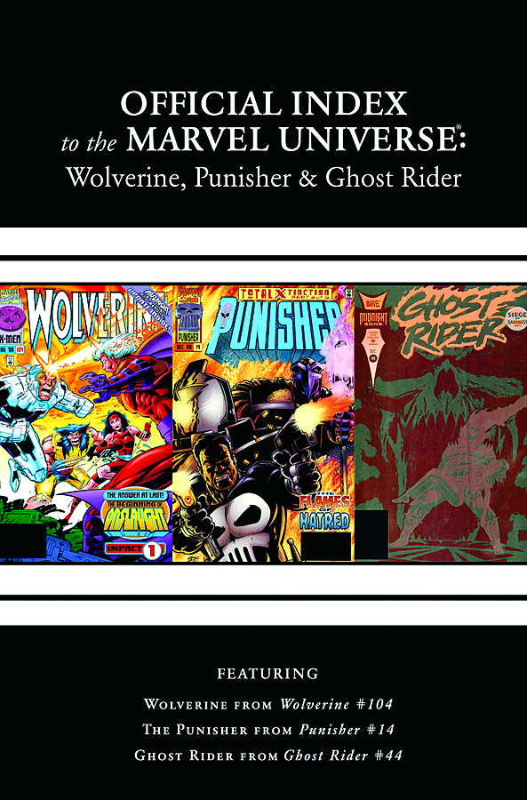 The chronicle of the Marvel Universe continues its coverage of Wolverine (from 1996's WOLVERINE #104), the Punisher (from 1996's PUNISHER #14) and Ghost Rider (from 1993's GHOST RIDER #44). Watch the Marvel Universe's history unfold month by month as we provide synopses for dozens of individual comics, including backup strips - introducing the characters, teams, places and equipment that appeared within; and providing vital information about first appearances, where they last showed up and where they appeared next!