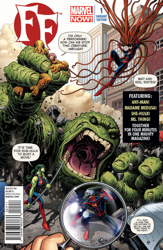 We have seen the future and it will be fantastic! In the absence of the Fantastic Four, a substitute Four, hand-picked by the real deal--Ant-Man, Medusa, She-Hulk and Miss Thing--stand ready to guard the Earth and the nascent Future Foundation for four minutes... NOW! what could possibly go wrong?