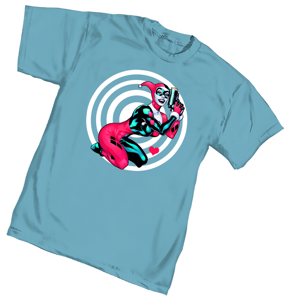 We have a Harley Quinn trifecta with three great new shirt designs. HQ: Swing shows an armed HQ imprinted in color on a black shirt while HQ: Bullseye is imprinted on Denim Blue and HQ: Silhouette on white. All 100% cotton and all great additions to your wardrobe. Lots of Harley Quinn goodies from Harley's past, present and future. Enjoy