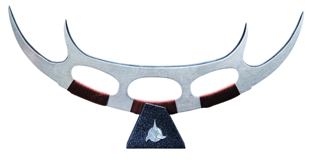 bat'leth itself means "Sword of Honor" in the Klingon tongue. Constructed of high-grade aircraft aluminium and featuring a genuine split-leather grip, this 1/1-scale prop replica measures 43" long, is 1/4" thick, and weighs an impressive 4 pounds. This is truly a substantial display piece and comes with a cold-cast resin display stand and Certificate of Authenticity.