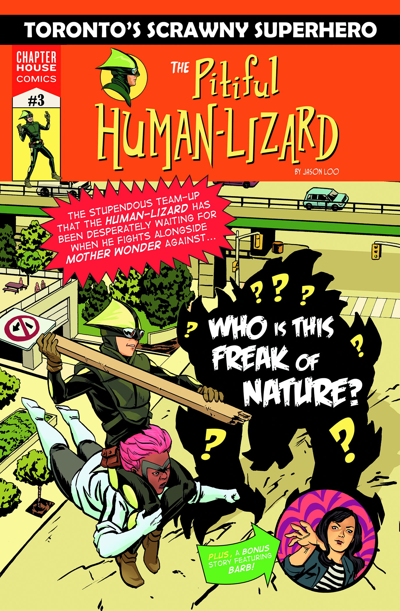 The Human-Lizard teams up with Toronto's best super-hero Mother Wonder! Plus, a 7-page bonus story featuring Barb! Chapterhouse presents the third of five reprinted issues of Harvest Loo's The Pitiful Human-Lizard. Creator Jason Loo will continue this lauded series beginning with issue #6 in February.