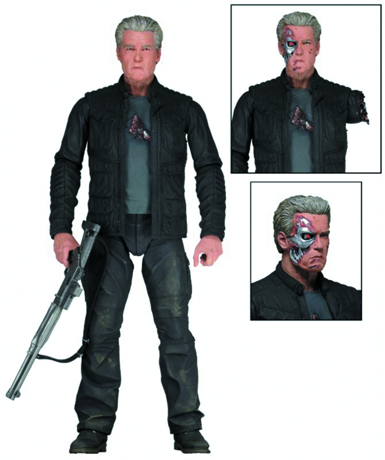 Guardian T-800 is based on his appearance in the movie's future timeline, when he's known to Sarah Connor as "Pops." The 7" scale action figure is completely accurate to the new movie design, with over 25 points of articulation for great poses. "Pops" is sculpted with the likeness of actor Arnold Schwarzenegger and comes with M4 shotgun accessory, two interchangeable heads, and interchangeable battle-damaged left arm. Window box packaging.