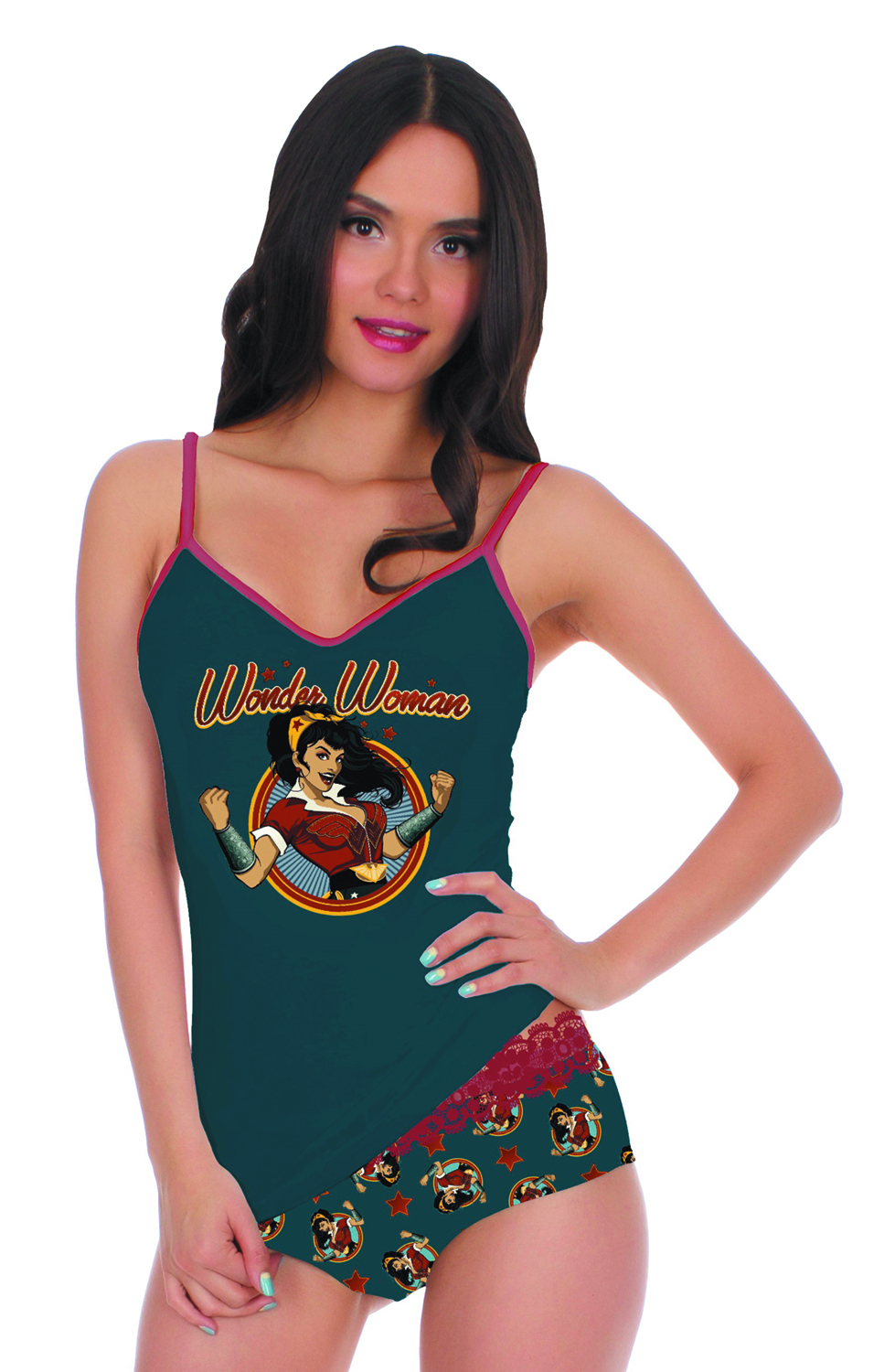 A PREVIEWS Exclusive! Ant Lucia's fan-favorite artwork of the DC Bombshells -- redesigns of DC Comics' super-heroines in a 1940s pin-up style -- is featured on these new panty and camisole sets from Underboss! Each set comes with a camisole top boasting a large print of the heroine and panties with multiple prints of the heroine and lacey pink fringe. The Harley Quinn set comes with a black camisole and matching panties, while the Wonder Woman set features a blue-gray camisole and matching panties.