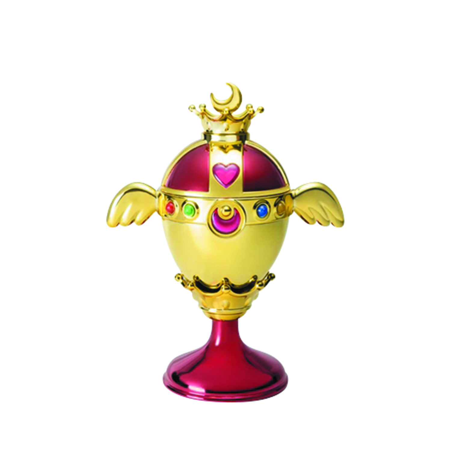 Rainbow Moon Chalice, the grail that Sailor Moon used to transform into Super Sailor Moon in the anime! The Rainbow Moon Chalice plays the transformation melody as well as many other sounds including a homage to the original toy. Open the top and you will find the crystal inside lights up in various colors. The Chalice is recreated in beautiful detail and finished with high quality metallic, suitable for discerning adult collectors.