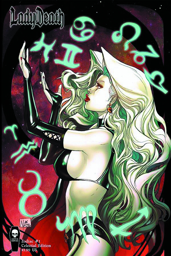 Lady Death: Zodiac #1, lushly illustrated with insane detail by Nei Ruffino and written by Bob Vardeman, explores the twelve signs of the Zodiac from a pagan perspective with the diva of death front and center. It's the zodiac as only Lady Death can present it: dark, dangerous and diabolical.