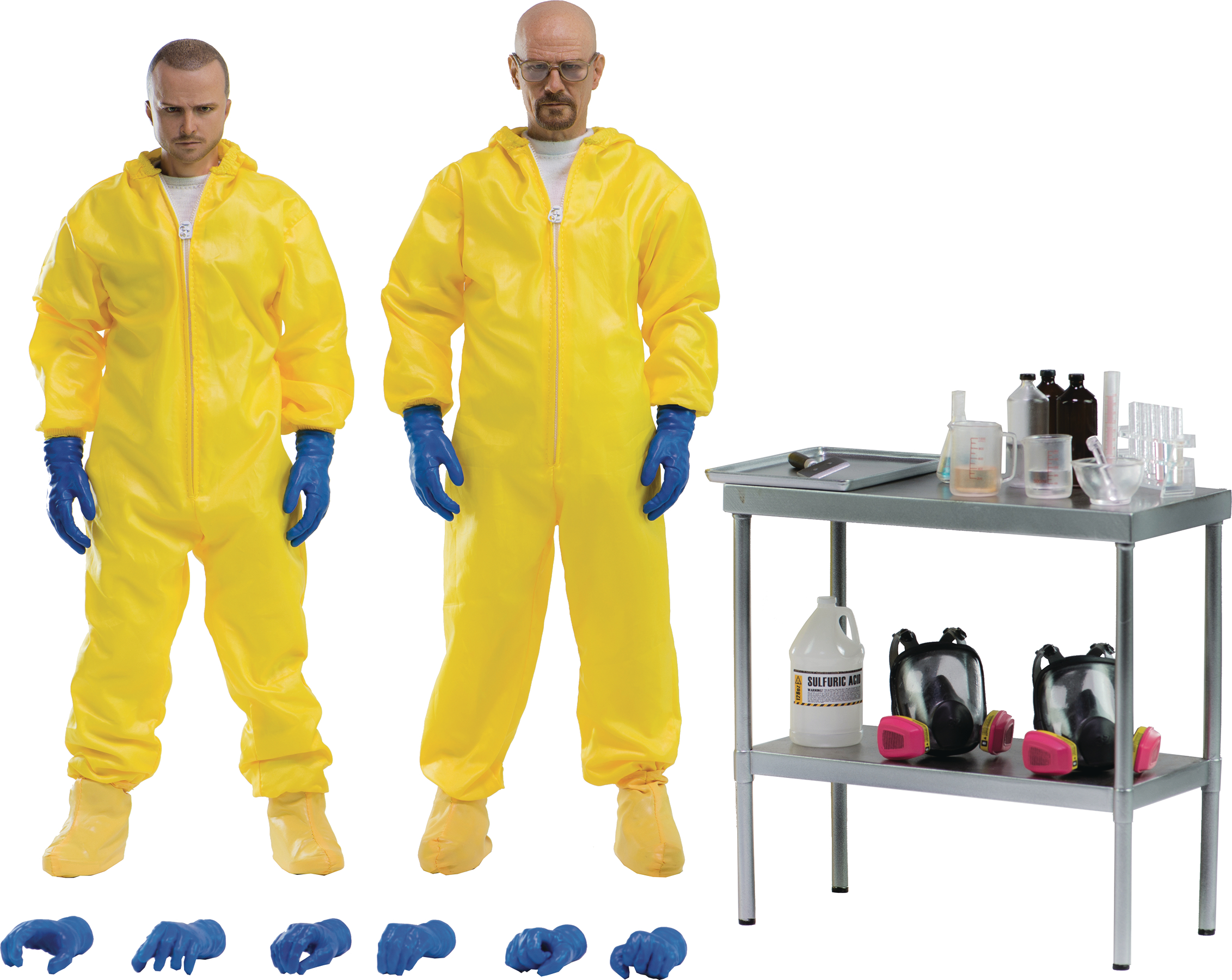 Breaking Bad. Both 1/6 scale figures are fully articulated with Heisenberg standing approximately 12.2" and Jesse standing 11.6". Jesse and Heisenberg come with a variety of extremely detailed accessories including Hazmat Suits, Gas Masks, a Lab Desk with equipment, interchangable clothing and 4 sets of extra hands for maximum posability!