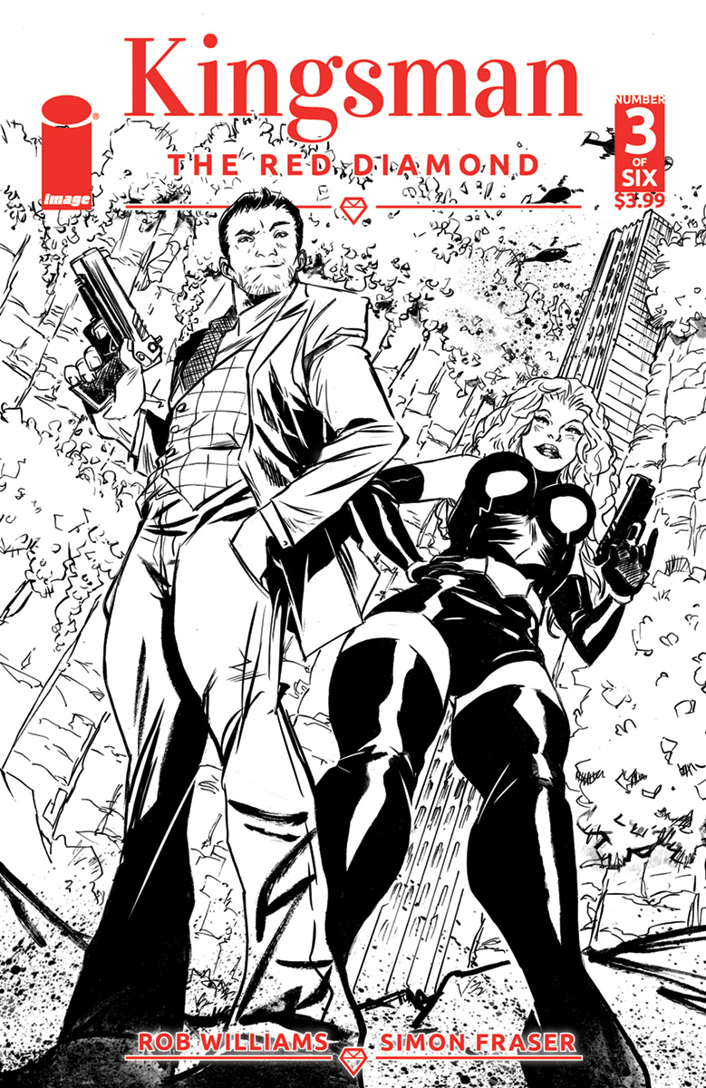 With the world's computers wiped out and its cities plunged into darkness, a group of mining magnates is summoned to a secret destination in the depths of Hunan Province. Determined to find The Red Diamond and restore order in the streets, Eggsy and Kwaito disguise themselves as rich jewel tycoons and jump in a helicopter headed for China. There, awaiting them, is a VHS tape- one that will blow their mission wide open. Issue number three of this unstoppable, action-packed miniseries contains violence, explosions, flying wingsuits, and vintage jets.