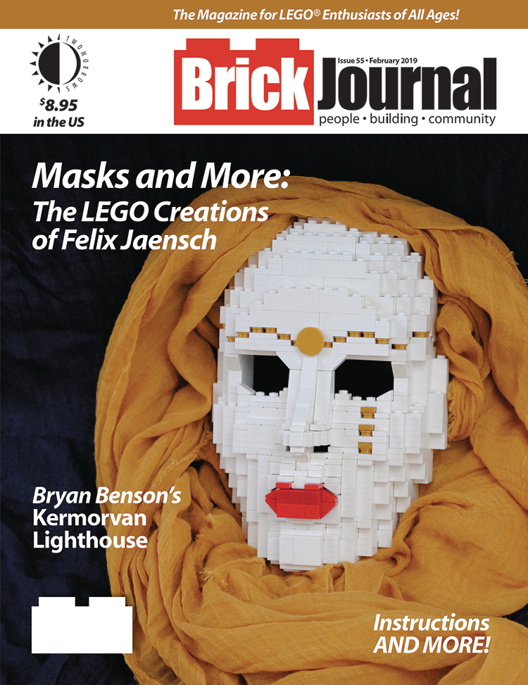 Felix Jaensch's remarkable LEGO sculptures, from realistic animals to the human skull and amazing face masks! Bryan Benson's detailed Kermorvan Lighthouse and how he built it from LEGO bricks. A spectacular Winter layout by Dave Schefcik! Plus: "Bricks In The Middle" comic by Kevin Hinkle, "You Can Build It" instructions by Christopher Deck, BrickNerd's DIY Fan Art, Minifigure Customization with Jared K. Burks, and more!