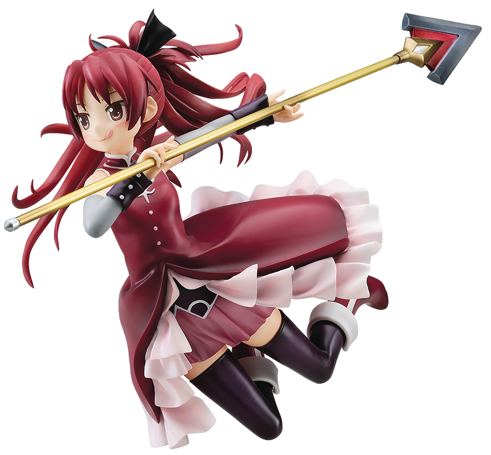 Kyoko Sakura in her Puella Magi outfit. The figure is based on the original key visual for the movie, originally illustrated by character designer Ume Aoki. The dynamic fluttering movement of her hair and outfit is a key highlight of this beautiful figure. Be sure to add her to your collection.