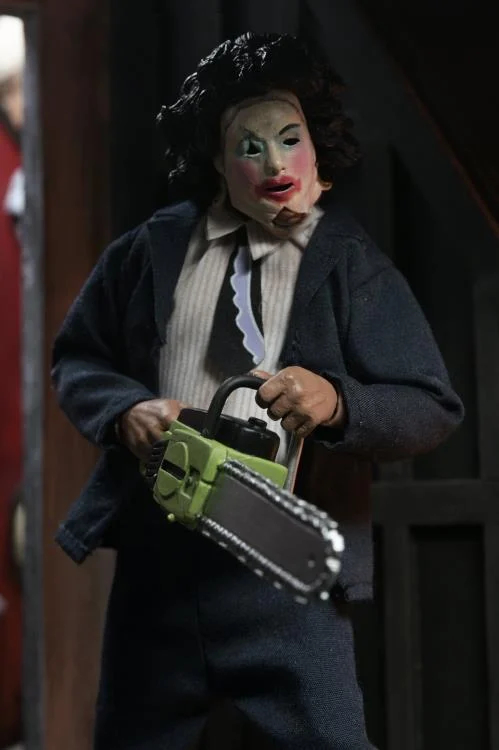 Leatherface in his Pretty Woman mask! The legendary killer comes dressed in tailored fabric clothing honoring the retro-style clothed action figures of the past. Donning his classic blue suit and infamous mask, this fully articulated, 8-inch figure includes his iconic chainsaw, an alternate hand, short hammer, knife, and bracelet accessories. Leatherface is all dolled up and ready to join your next family dinner! Comes in collector-friendly window box packaging.