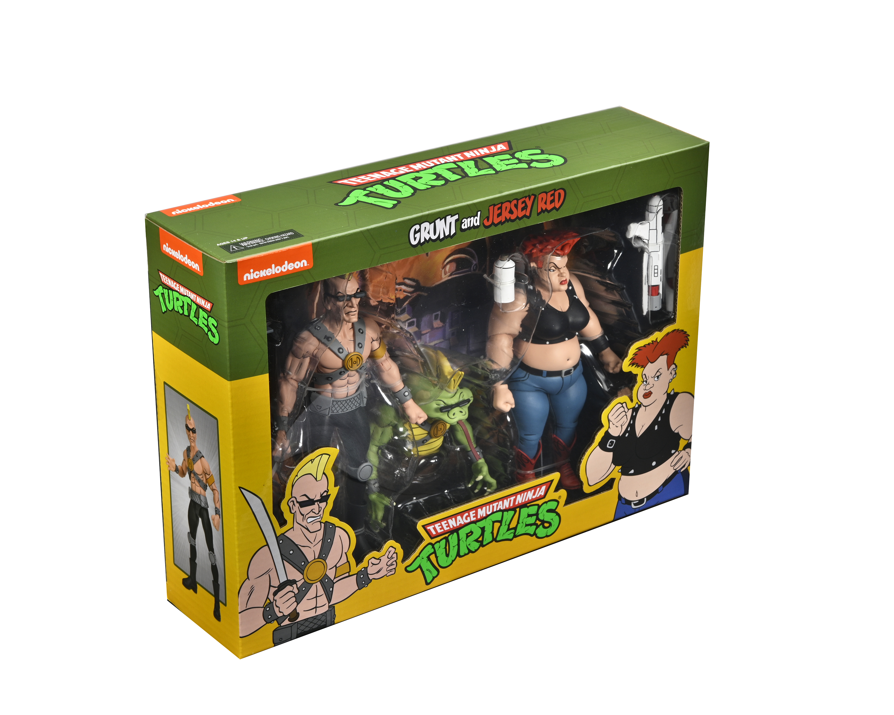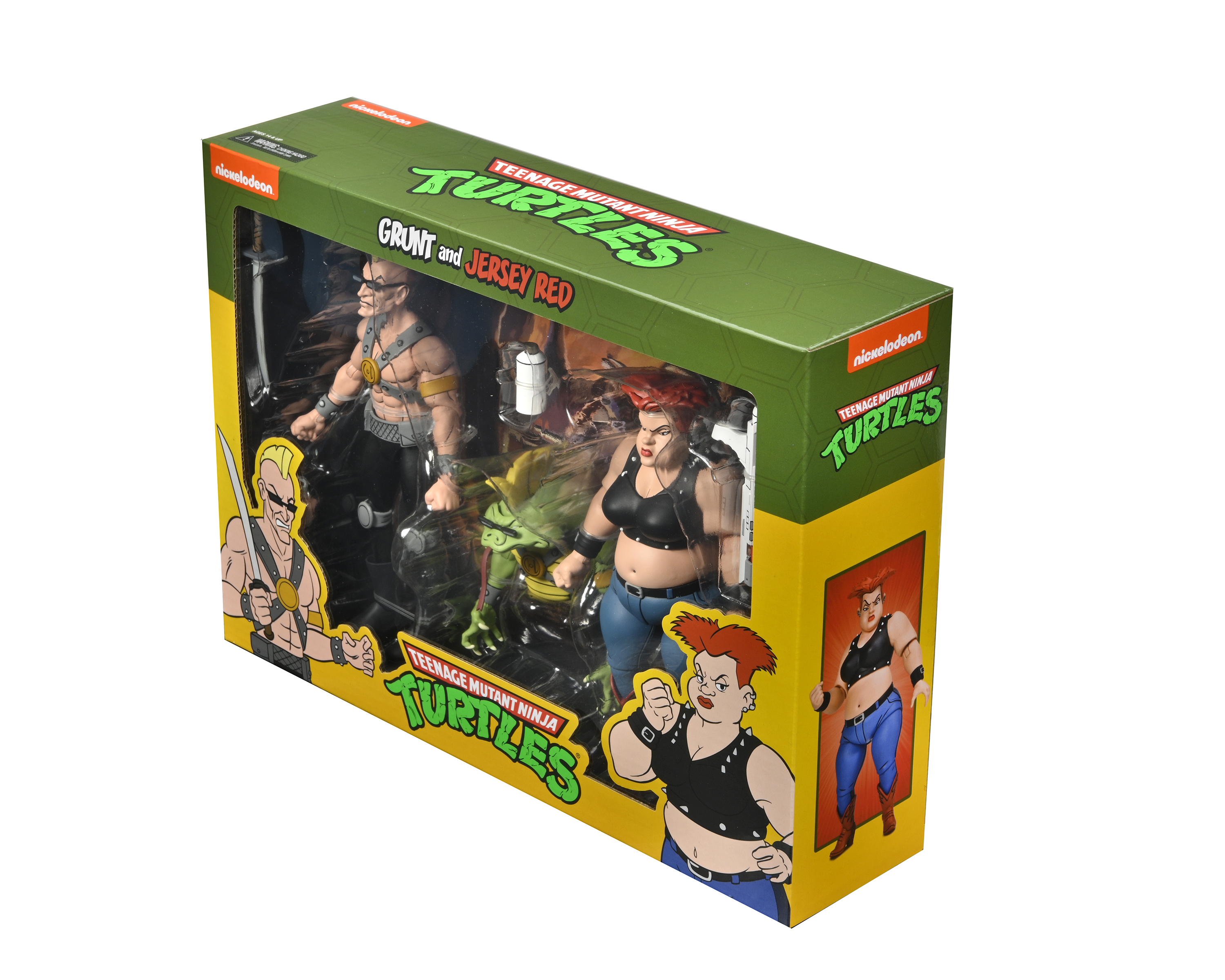 Rocksteady's full gang with this 2-pack of action figures that are ready to rumble. Jersey Red might have avoided mutation, but her mohawk-sporting pal Grunt was not so lucky. This set includes two 7" scale action figures and accessories. Jersey Red comes with extra hands, laser, and a retro mutagen aerosol can. Grunt comes with interchangeable mutant parts, sword and extra hands. Comes in the classic cartoon 2-pack style packaging you all know and love.