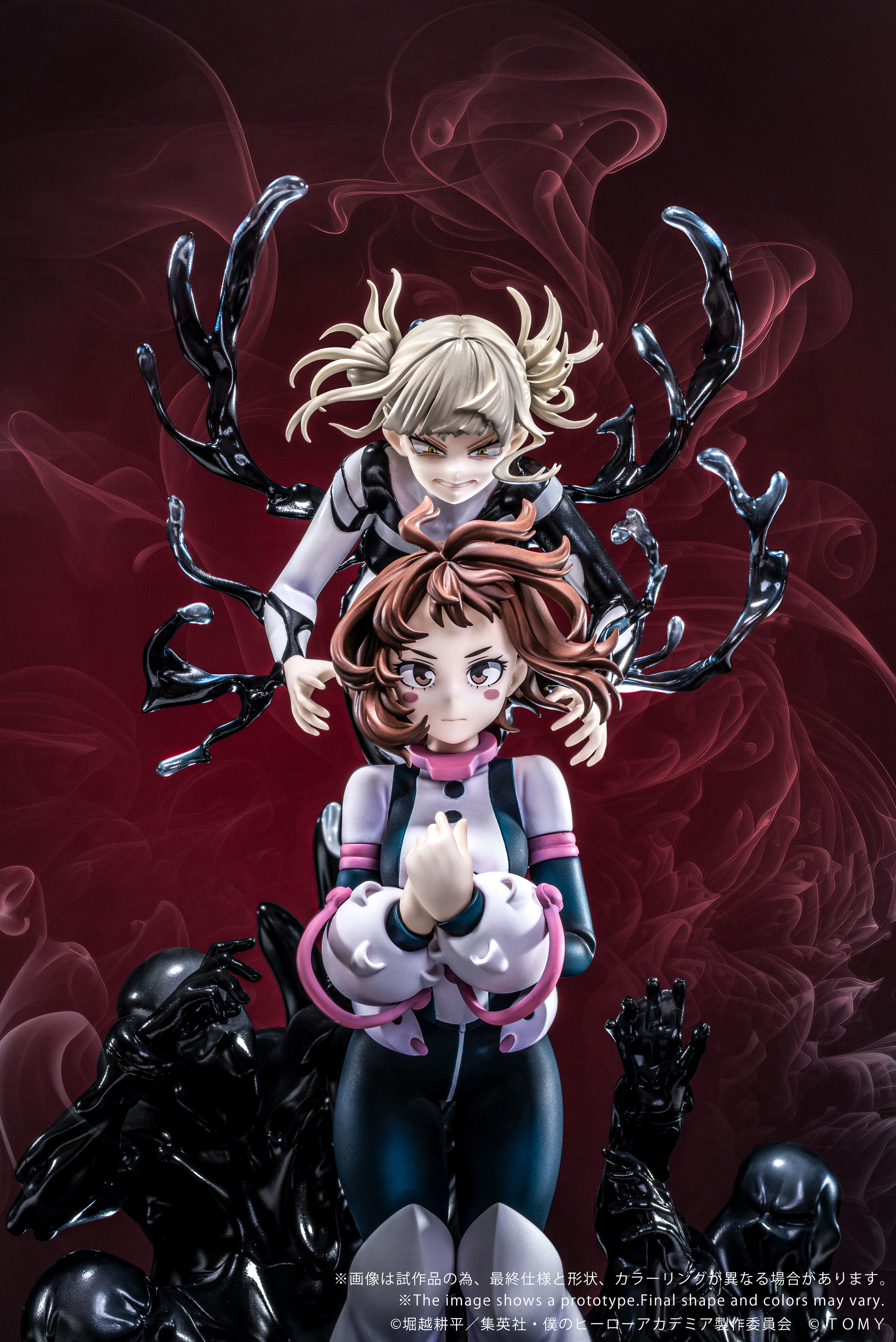 My Hero Academia. This figure depicts Himiko Toga's transformation into Twice and the infinite Twice clones proliferating from her, expressed on the base. It is a 1/10 scale vignette figure featuring Ochako Uraraka and Himiko Toga crafted with powerful sculpting.