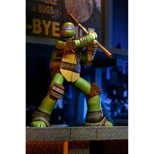 From NECA. Booyakasha! NECA is proud to present all-new Ultimate action figures from Nickelodeon's hit 2012 Teenage Mutant Ninja Turtles animated series! Known for its dynamic animation style and character-driven storytelling, the acclaimed show reimagined the heroes in a half shell for a new generation. This 7-inch scale Donatello figure captures the inventive turtle with incredible painted details to replicate his animated appearance. He includes an array of episode-specific accessories: interchangeable heads and hands, bo staff, tracking device, goggles, pizza slice, smoke bomb, Turtlecom, and Dr. Cluckingsworth M.D. The figure comes in collector-friendly packaging with illustrations by TMNT artist Ciro Nieli.